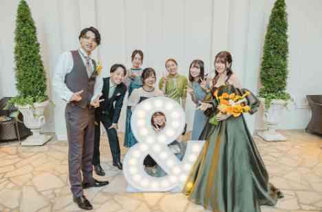 プール周りのガーデンには、電球の【&】の装飾をご用意されたお2人。 披露宴会場からガーデンへ移動して、皆様とのお写真撮影! 雰囲気が変わるのはもちろん、外へ移動することで解放感を感じていただけるからこそゲストの方ともより会話が弾み自然体で皆様お過ごしていただいておりました! 自由に過ごせる貸切ならではの過ごし方ですね!