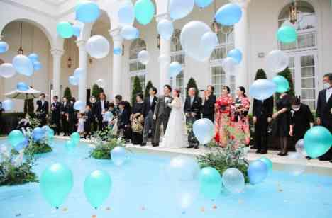 挙式後は、プールでドロップアンドフライのセレモニー。 プールの上にはお2人こだわりのお花の装飾を浮かべました。 そこへゲストの皆様と一緒に青いバルーンを投げ入れる演出を行いました。 この後は青空へバルーンが舞い上がり、ゲストの皆様とご新郎・ご新婦様みんなで盛り上がるお時間となりました。お写真も素敵に残すことができます。