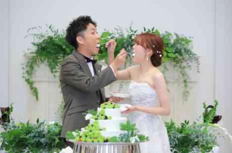 ケーキもお2人のお好みの装飾で彩りました! マスカットだけでなく、グリーンの装飾もしていただくことでケーキがとても華やかになり、お写真にもキレイに残すことができます。 そんなお2人こだわりのケーキでファーストバイトのセレモニー。 お互い一緒にみんなの掛け声で【あーん】と食べさせあう姿はとても可愛らしいシーンとなりました!