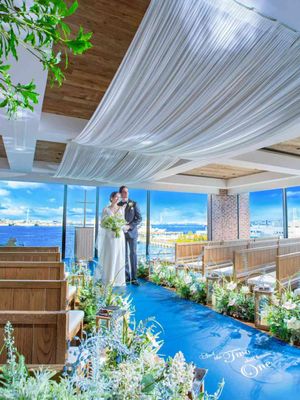 どこまでも続くような、みなとみらいの海と空。美しい天空のチャペル