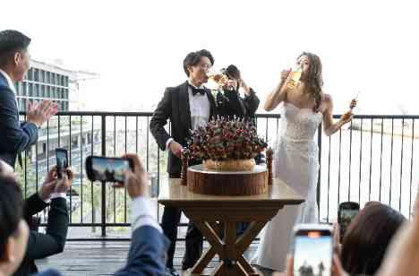 結婚式っぽい演出ではなく自分達らしい演出がしたい!というお酒好きなおふたりにブロシェットタワーを提案しました。普通ウェディングケーキじゃない??と見たことのない演出にゲストも大盛り上がり!披露宴会場から続く海辺のテラスでビールで乾杯した後は、ゲストも思い思いにお肉とビールを片手に思いっきり楽しんでいました。