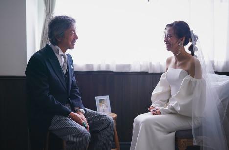 新婦様のウェディングドレス姿を楽しみにされていた写真の中のお母様。そしてお母様が亡くなられた後もいつも新婦様お話をたくさんきいてくれ一番の味方でいてくれるお父様。挙式の前にそれぞれの気持ちを整える意味でゆっくり三人で過ごす時間をつくりました。チャペルに向かう前のベールダウンはお母様と一緒にお父様の手で行われました。