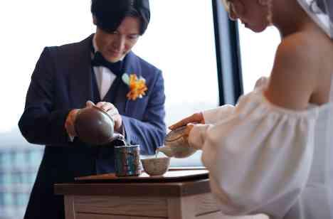 生まれた地域はすこし離れているけれど、同じ静岡県出身のおふたり。おふたりならではの演出を取り入れたお式を希望されたおふたりにお茶を入れるセレモニーをご提案しました。それぞれの土地で採れた茶葉でいれたお茶を、ご実家から持ち寄られた湯呑に急須でお茶を注ぎ、お互いに酌み交わしました。派手さはないけれど心が温かくなるおふたりらしいセレモニーでした。
