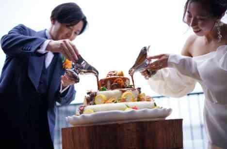 新郎様が大好きな季節の野菜を使ったカレーライスタワー!新郎様へのファーストバイトはみなさんに食べて頂くこのカレーではなく、別に用意した激辛カレーのサプライズバイト!新郎様の辛そうな表情を見てゲストも大盛り上がりで新婦様にとってもワクワクする時間になりました。後日ゲストからは、ふたりらしい楽しい演出でカレーも美味しかった!と言っていただいたそうです。