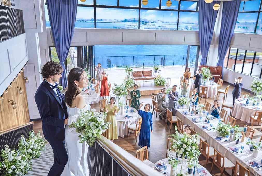 2面海の見える解放感抜群のパーティ会場は、窓を開ければ爽やかな海の風が。迫力の階段入場はもちろん、テラスからの入場もおすすめ!(最⼩10名〜推奨100名)