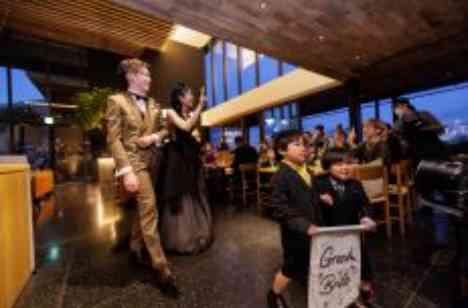 黒のカラードレスに衣装チェンジをし、再入場です。 お二人を先導してくれるのはかわいらしい二人のフラッグボーイ🚩 緊張しながらも一生懸命務めてくれた二人。会場全体の雰囲気が和やかになりました。 再入場の後はテーブルフォトを行いました。 中々会えないご親戚やご友人と近い距離で会話に花を咲かせました。