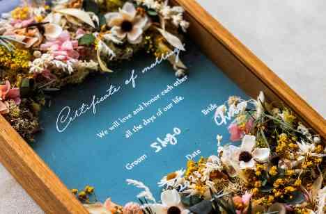 お二人のご用意された結婚証明書にたくさん並んだ様々なお花。こちらはゲスト皆様に、お好きな場所に一輪一輪差して頂き、一緒に作り上げました。今後もご自宅に飾れるものとして選んでくださった証明書。 これを見るだけで結婚式のことがいつでも思い出して頂けそうですね♪今後もインテリアとして飾れるアイテムを選んで頂くことはとてもおすすめです!