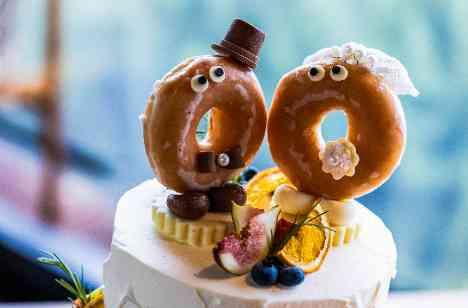 こだわったのは料理だけではありません。ケーキにもしっかりこだわり、お二人で決めて頂きました。2段のかわいらしいケーキのトップには大きく口を開けているように見えるドーナツの新郎新婦♪ お写真映えばっちりでした!!ゲストもたくさんお写真を残してくださいました。 お二人のご希望を伺いながら、完全オリジナルケーキも作成可能です♪