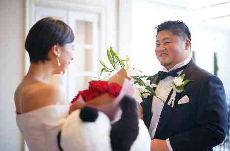 ご新婦様のドレス姿をずっと楽しみしていたご新郎様。ご新婦様にはサプライズで21本のバラの花束を用意してくださりました。21本のバラの意味は「あなただけに尽くします」ぬいぐるみ屋さんのご新郎様らしく、パンダのぬいぐるみにバラの花束を持たせてご新婦様にプレゼントされました。まさかのサプライズに笑顔と涙の溢れるファーストミートになりました。