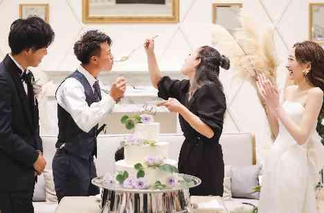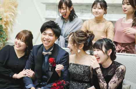 お二人のご友人ご夫婦に、お二人のお手本となっていただけるようにファーストバイトを行っていただきました。息を合わせて同時にバイトを行い、見守るゲストはとても盛り上がる演出となりました。 また、お色直しのドレス当てクイズでは珍しいブラックドレスをお召しになっていたのでゲストも想像していなかった姿に驚き、とても嬉しそうにされていらっしゃいました。