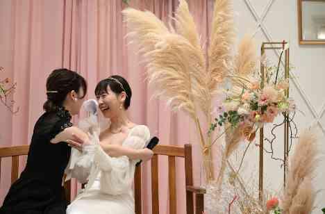 おふたりが選んだくださった高砂はソファ席。せっかくなので、ご友人からのスピーチは、ソファ席にお友達とふたりだけで座ってお話ししていただきました。距離がグッと近くなり、緊張も涙も嬉しい気持ちも全部ダイレクトに伝わって、思わずハグ・・!大好きが溢れた瞬間でした。ご友人のお母様も、新婦のお母様も、ゲストの皆様からも涙があふれていました。