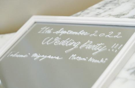 結婚証明書はゲストおひとりおひとり、全員にご参加いただきたいとのことで皆様にご署名をいただくスタイルになっています。ミラーにお名前が増えていくたびにどんどん完成されていきその過程がゲストの方おお楽しみいただくことができます。本番はおふたりが挙式内で披露され皆様から拍手をいただき素敵な時間が生まれました。挙式後はご自宅のお部屋に飾っていただいています。