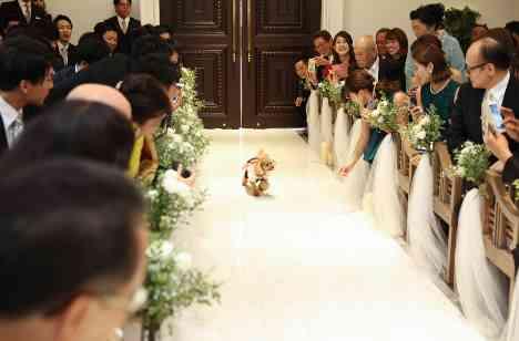 小さなお子様のご参加がなく、リングを運んできてもらう演出をどうしようかと悩んでいたおふたり そこでえりかさんの愛犬のダッフィーちゃんにリングドッグをして頂くことに おふたりのダッフィーちゃんを呼ぶ声と ダッフィーちゃんが一生懸命おふたりにマリッジリングを運ぶ姿に 会場のが笑顔に包まれとてもあたたかいシーンになりました