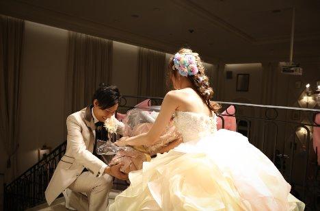 お色直し入場は1Fからむねゆきさん 続いて2Fからえりかさんにご登場頂きました なにかえりかさんにサプライズしたいというむねゆきさんに 真っ赤の100本の赤バラの花束を持って2Fで待っているえりかさんをお迎えに行って頂きました お姫様になりたい!というえりかさんの夢を叶えて頂きたくご提案させて頂きました