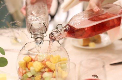 8月という季節感と、ゲストへのおもてなしを、というお二人のご要望から、フルーツポンチラウンドをご提案しました。 色とりどりのフルーツに、ソーダを注ぎながらテーブルをラウンドしていき、ゲストの皆様にはスペシャルデザートとしてお召し上がりいただきました♪