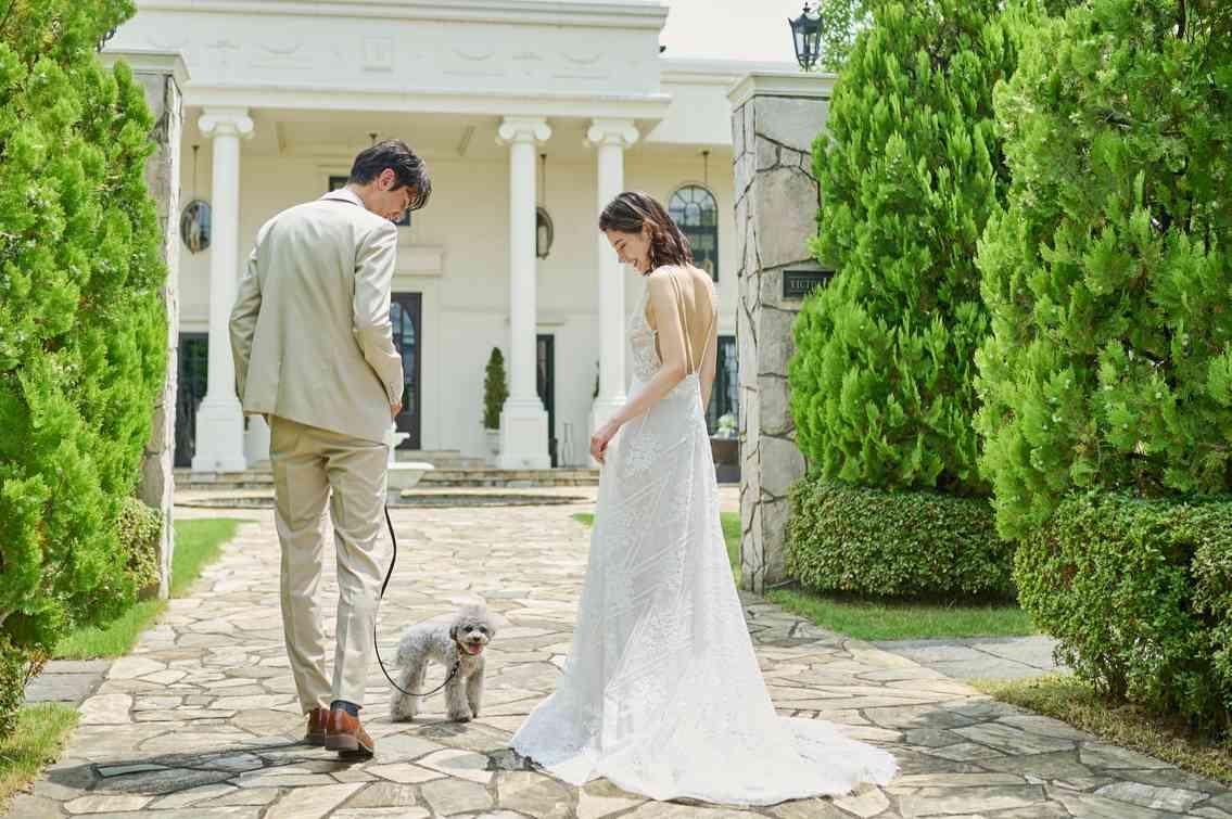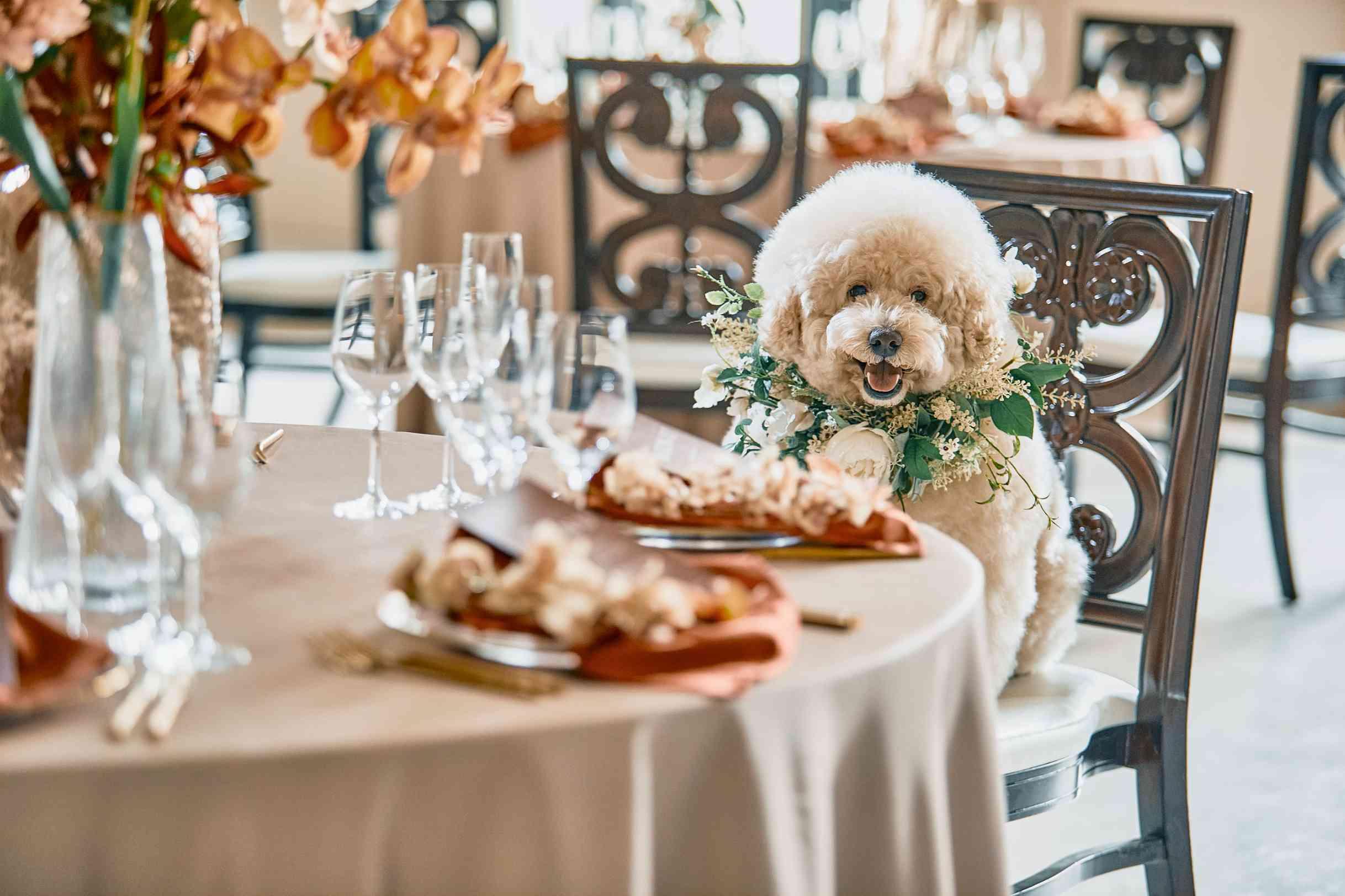 ⼤切なゲストをお迎えするウェルカムドッグや挙式のリングドッグ⼊場、証明書への⾁球署名、パーティスペースでペットとゲストたちとのふれあいタイムなど、ペットの可愛い姿が沢⼭⾒られるのは貸切空間の魅⼒!