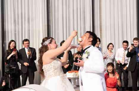 まるで海外リゾートのような空間をとても気にっていた新郎新婦様。 はじめに皆様にガーデンに出てきていただきガーデン演出がスタート! 360°の角度から皆様に見守られながらのケーキ入刀のセレモニーは、とても暖かな空間となりました。