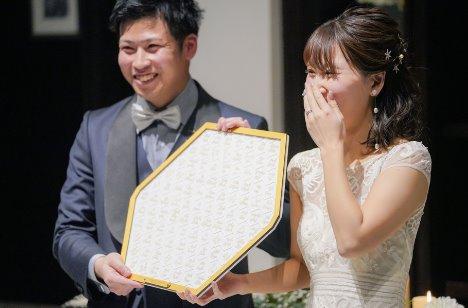 テーマアイテムでもあるクリア素材のお席札をテーブルラウンドで皆様にパネルにはめていただき、結びにお二人のお名前とテーマをはめて完成させるセレモニー。結婚式が結んだ後もお二人とゲストの想いが詰まったアイテムをお二人のご自宅に飾っていただける演出です。