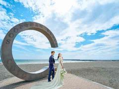 湘南の海をバックに絶景のロケーションフォト、当日のウエルカムパネルやムービーに使用するのがおすすめ。前撮りで撮った写真は当⽇のウエルカムスペースや招待状に使うことができる。結婚式準備におふたりらしさを加えてみて