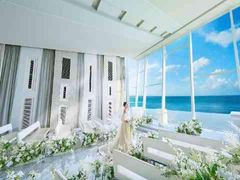サザンビーチが⽬の前に!天井⾼7M、ガラス張りの陽光が差し込む⾃然溢れる開放的なオーシャンビューのチャペル。ゲストとの距離の近さも魅⼒的で当⽇は笑顔を⾒ながら素敵な時間を過ごして。フェアではチャペルでの本番さながらの挙式体験も可能!