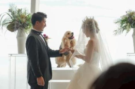 お二人が選んだのは大好きなゲストに誓う人前式。どんな時もずっと三人で過ごしてきたからこそ誓いの場には居なくてはならない存在の愛犬。 誰もが緊張してしまう挙式も、愛犬と一緒なら気持ちもほぐれていつも通りのお二人らしく過ごせます。 お二人と一緒にいる姿を見て、ゲストもほっこり、温かさが伝染する空間に。