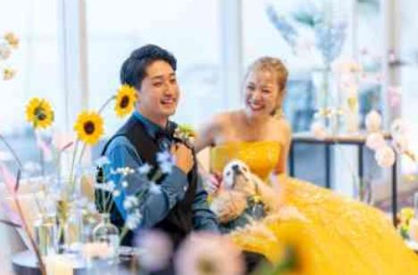なるべくゲストとの距離は近くしたい!沢山話もしたいし気に入ったドレスで沢山写真も撮りたい!そんなお二人にソファー席をご提案。茅ヶ崎迎賓館の魅力であるサザンビーチの海をバックに沢山写真を撮り一生の思い出作りをしました。会場装飾には新婦様が大好きなひまわりを添えて。当日はドレスの色と最高の組み合わせでした。