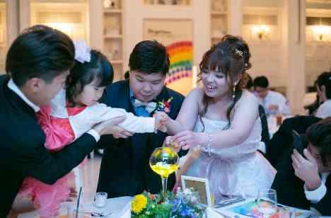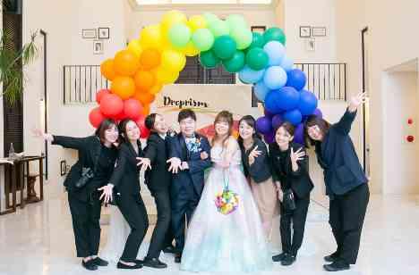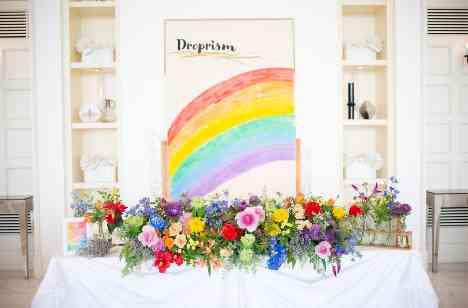 ご披露宴はお二人とこれまで考えてきたテーマを沢山表現しました。お二人の背景やテーブル、ゲスト全員のランチョンマットもレインボーで統一していきました。またお料理もテーマ表現する為、一品ずつ色を変えていき、ラストのデザートのクリームでレインボーの答え合わせをするという遊び心を取り入れました。ご新婦様のお色直しドレスや、ブーケもレインボーで統一しテーマをよりゲストへ感じて頂くご披露宴にしていきました。