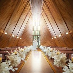 昨年リニューアルした「光のチャペル」。上質で洗練されながらも温かみがあり、入場口から差し込む光と祭壇を照らし出す光が一筋の光として織りなす光景は神秘的。祭壇奥のシンボルツリーが二人を優しく見守ります。
