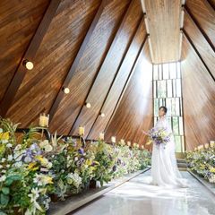 昨年リニューアルした「光のチャペル」。上質で洗練されながらも温かみがあり、入場口から差し込む光と祭壇を照らし出す光が一筋の光として織りなす光景は神秘的。祭壇奥のシンボルツリーが二人を優しく見守ります。