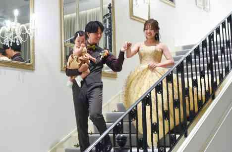 披露宴会場の階段から映画のワンシーンの様な素敵なご入場♡ご新婦様のカラードレスに合わせて、ご新郎様の蝶ネクタイとお子様のドレスもお色直し。とっても素敵な入場シーンでした!入場できる扉が3ヵ所あるので、サプライズ入場もとっても盛り上がる演出の1つです!入場後は、3人で各ゲストテーブルを周りお色直し後のお衣装でもたくさんお写真を残していただけました!
