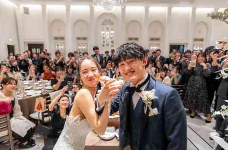 ご披露宴のお時間ではゲストも一緒に楽しめるドーナツバイトをご提案いたしました!披露宴会場をゲストとのアットホームな距離感にするため、メインテーブルとゲストテーブルの位置を近くに作っています。だからこそ自然とゲストの方がおふたりの近くに集まってきてくれます♡ ドーナツバイトをしておふたりだけではなくゲストの皆様にも笑顔のバトンがつながっていきます…!