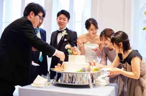 ウェディングケーキはおふたりだけではなく、みんなでバイトのお時間を♡ おふたりだけのセレモニーではなく、感謝を伝えたいゲストの方に登場していただいてサンクスバイトのお時間を提案いたしました! おふたりにもゲストの方にも記憶に残る…そんなお時間にしていただきました♡ アットホームな距離感で過ごしていただけるからこそ出来る演出のひとつです!