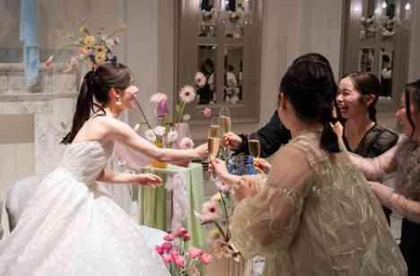 披露宴は堅苦しくなく、アットホームな空間にしたい、ゲストと沢山お写真を撮りたいとご要望をいただいていました。結婚式では、主役のお二人のいるメイン席に近づきづらい、そんな雰囲気が出てしまいがちですが、メイン席とゲスト席の距離感にもこだわって会場のレイアウトを組ませていただきました。ゲストが自然とお二人の周りに集まってきてグラスをあわせる空間ができました。