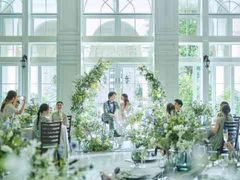 どんなコーディネートも映えるホワイトカラーのパーティ会場は、窓外の緑に心癒される、ナチュラル感と上品さを兼ね備えたおもてなし空間。ゆとりある広さなので、ドレス姿でもゲストのもとへ自由に動きまわれるのもポイント。陽光が眩しい開放的な空間でふたりとゲストを包み込む。