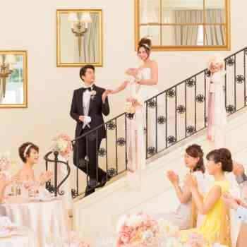 - 新郎のエスコートでシンデレラ階段からの入場はゲストからの注目の的。ドレスをより一層美しく輝かせます。