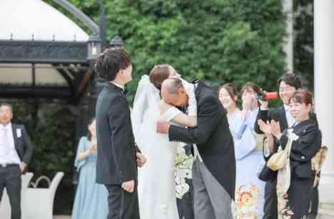 打合せの中で大好きなお父様へしっかりと感謝を伝えたいとお伺いし、どこで伝える場面があるのかを考えました。実際に挙式会場でのファミリーミートを行いその瞬間も感謝の思いを伝えましたが、ゲストのみんなにも感じてもらえる瞬間がないかと思い、ガーデンでのセレモニーでもお伝えをしないかを相談していました。 そこで生まれた瞬間がフラワーシャワーのラストがお父様だったので、ハグを行い見届けてもらうシーンでした。