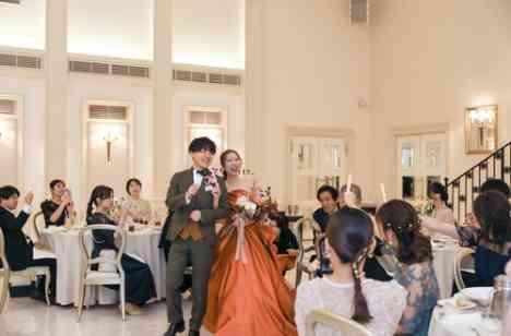 披露宴会場内にサプライズ登場が叶う、階段を常設!お色直しの入場は自分たちの好きな曲に合わせて入場しました。 テーマのひだまりに合わせた、温かみのあるオレンジのドレスとタキシードで入場して、ゲストの皆様も温かい笑顔で向かい入れてくれています。 皆様の手元にもテーマカラーのオレンジのペンライトで、入場時のゲストの皆様の歓声も素敵な瞬間でした。