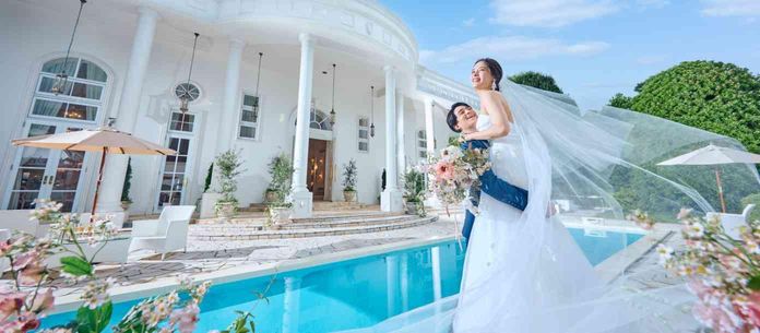 【ホワイトハウス】プールと緑と空の光に輝く白亜の大豪邸はお二人だけの貸切に!