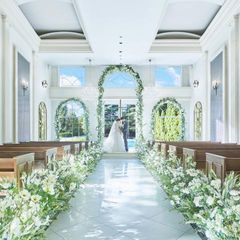 【自然光が溢れるプライベートチャペル】ガラス張りの祭壇から広大なガーデンを望み、暖かな自然光が差し込むプライベートチャペル。自然を感じる幻想的な空間で、大切なゲストに祝福される感動的な挙式が叶います。