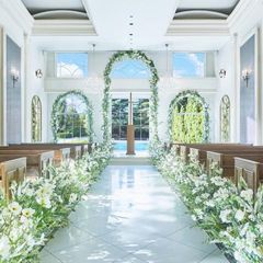 【自然光が溢れるプライベートチャペル】ガラス張りの祭壇から広大なガーデンを望み、暖かな自然光が差し込むプライベートチャペル。自然を感じる幻想的な空間で、大切なゲストに祝福される感動的な挙式が叶います。