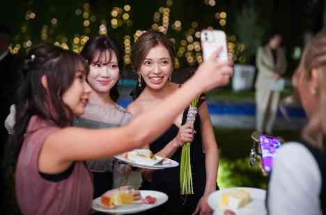 ご披露宴のデザートは広大なガーデンで、ビュッフェ形式にてご提供しました。 お席の決まっていないガーデンだからこそ、ゲスト同士の距離も近づきアットホームな自由度の高いお時間に♪おふたりと自由にお話しをしたりお写真を沢山撮影したりする事も可能です。披露宴会場内では、新郎様新婦様は座ったままでのお写真撮影が多いですが、運命の1着であるたせつなドレス姿を全身姿で皆様に残していただけるお時間ともなります。