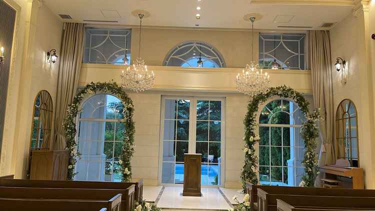 白に少しブラウンも入ってる温かみのあるチャペルで披露宴会場も白だったのでどんなお花やドレスでも合いそうだと思った