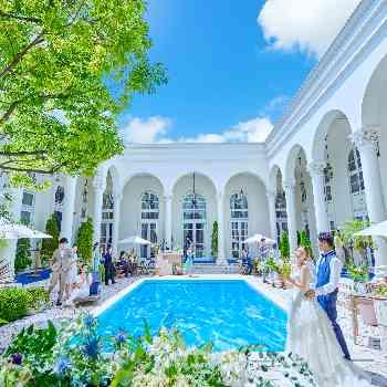 圧巻のスケールの大階段で祝福溢れる憧れ演出。他にも純白のチャペル、披露宴会場にはプール付きプライベートガーデンを併設。当日は時間すべての空間が完全貸切なので、時間帯毎の印象的な思い出を残せます。