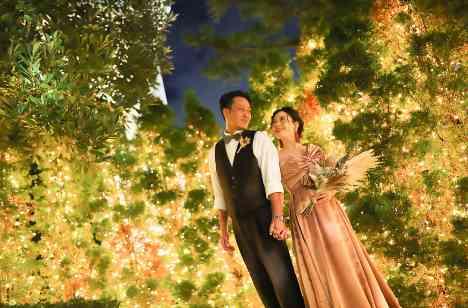 【披露宴の貸切タイム】貸切時間を使ってフォトシューティングを♪イルミネーション輝くガーデンにておふたり衣装姿が映え、忘れられないワンシーンに。まるで海外で撮影しているかのようなロマンチックなショットを取ることができる!ナイトシーンでたっぷり撮影の時間が撮れました。会場全体がフォトスポットになるのでどこで撮影しても楽しかったです!