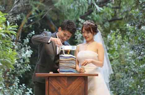 世界にひとつの結婚証明書をつくりたいと思いサンドセレモニーを証明書にすることが決定しました。挙式前にゲストの方々に参加していただいて、人前式ではサンドセレモニーを行いました。 砂は1度混ぜると2度とわけることができない、「これからふたりはひとつの家族として生きていく」という意味を込めてられているそうで、砂の色には、世界にひとつだけのサンドアートを完成させることができました!