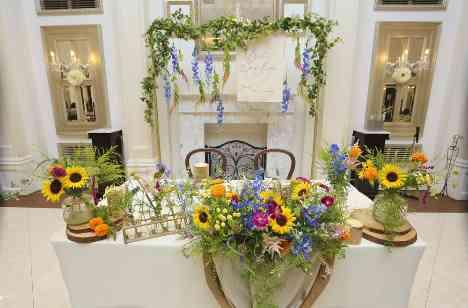 大好きなひまわりに囲まれたメインテーブル装飾し、ゲストに囲まれた空間で写真撮影にたくさん使用しました。ゲストとお写真を撮る時間やお話をする時間を多くとらせていただきました。 新郎新婦がそれぞれ好きなテーブルに行ってお話をしたり、お写真を撮ったりすることで自由で楽しい雰囲気で過ごしていただけました。アットホームな時間となりました。
