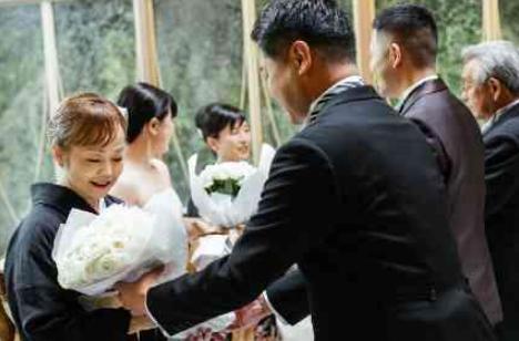 お打ち合わせの中で、新郎家の親御様がご結婚式をされていないことを伺っており、おふたりのご結婚式で何かできないか、、、、そんなご相談を頂いておりました。 今だからこそ出来るご提案として、親になった今のお姿を堪能して頂こうと思いました。黒留袖とモーニングのお姿でファーストミート。合わせてサプライズの白バラをお渡ししました。家族がひとつになる瞬間。笑顔が溢れるあったかい時間でした。