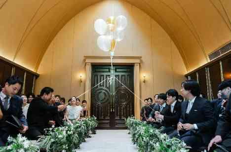 挙式で交換する指輪をバルーンに付けて、ゲストにリレー形式で新郎新婦の手元まで届けてもらうセレモニー。風船がゆらゆらと揺れて新郎新婦に近づいていくので、遠くで見ているゲストにも分かりやすいのが特徴です。バルーンのインパクトと、ゲスト同士も関わることが出来るので挙式から一体感が出て、みんなで楽しめる演出の一つです。