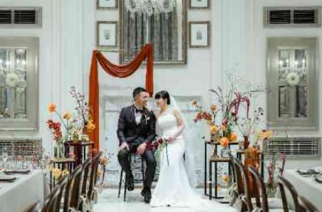 披露宴会場は丸テーブルだけでなく流しテーブルも使いたいとご希望でした。オシャレなレイアウトを、ゲストの人数も含めて相談しご提案させて頂きました。当会場は、ドレスショップやフラワーコーディネーターが会場内におりますので、よりトータルコーディネートがクオリティ高くお手伝いさせて頂いております。ドレスがより際立ち、メイン装飾もこだわりぬいたトータルコーディネートはゲストの方の反応も盛り上がりました。