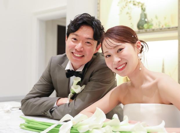 メイン席は、おしゃれなハイチェアを使用し、緑が沢山あるコーディネートに。マーメイドドレスが映える装飾をフラワーコーディネーターさんに提案してもらいました。乾杯をすると、披露宴会場に大きく広がるカーテンが一斉にオープンして、より明るく開放的な雰囲気に。ゲストそれぞれとグラスを交わしながら、感謝を伝えることができました。